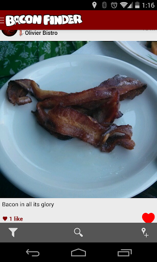 BaconFinder helps you find the best bacon-serving restaurants near you. We’ve started things off by listing some of our favorite bacon places in a number of cities across the nation. And more importantly, you can add and vote on your own favorite local bacon. Download Bacon Finder now and join the bacon-loving community. With your support, BaconFinder will becomes the best resource for bacon lovers when the craving strikes.