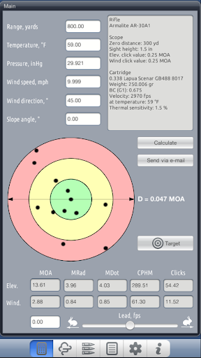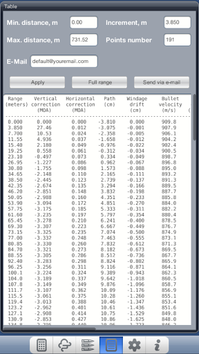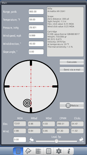 “Ballistics” features a fast ballistic solver based on G1-G8 drag models. Supports input/output in Imperial and Metric units. Elevation and windage adjustments are presented in MOA, MRad, MDot, CPHM, IPHM, IPHY and clicks. Instant holdover is visible on a reticle. Profiles for rifle and ammo data are saved, so all you have to enter for quick solution is range and shooting conditions.