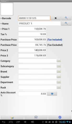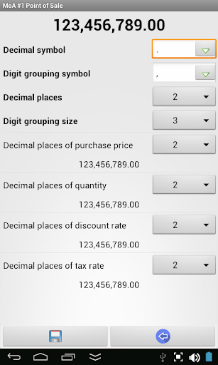 ●You can set decimal places for sale price, purchase price, sale amount, discount rate and tax rate separately. You can customize decimal symbol, digit grouping symbol and digit grouping size settings. According to the settings you have done the numbers are formatted as they are input and displayed.