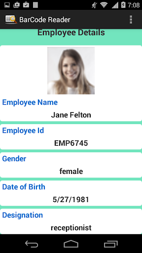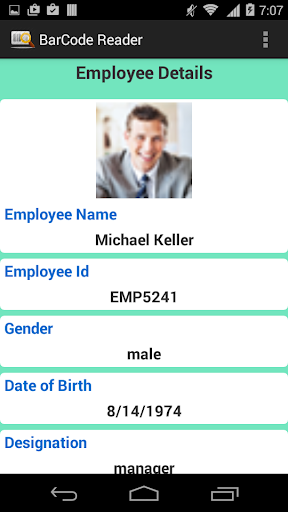 The main feature of this application is to read employee’s barcode and displays his/her details such as name, gender, designation etc.