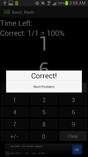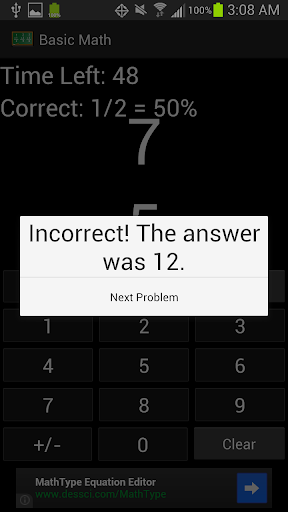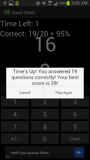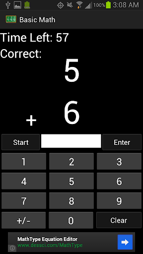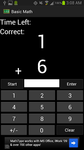Basic Math For Kids is a simple math game for kids to learn and master their addition and subtraction skills. A simple layout allows kids to focus on learning math, not on figuring out a complex interface. Choose between Practice Mode or Timed Mode. In each mode, you can choose to practice addition only, subtraction only, or addition and subtraction. You can also choose if you want to allow negative answers for subtraction problems. It also allows you to set the minimum and maximum range of values to use for the problems. In Practice Mode, there is no time limit, allowing kids to take their time learning their addition and subtraction skills. It keeps track of the number and percentage that they get right as they go. In Timed Mode, you have 60 seconds to answer as many problems as you can. It also keeps track of the your all-time high score.