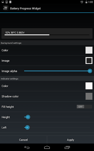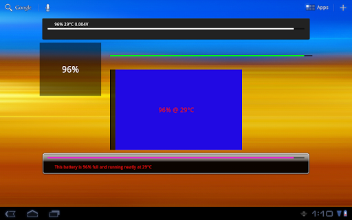 The widget shows battery percentage bar (like a progress bar) and can also show a text containing the battery percentage, temperature and voltage.