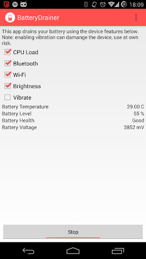BatteryDrainer is an application, which can be used to help drain your devices battery as fast as possible. The usual use case of would be to drain the battery to calibrate it.