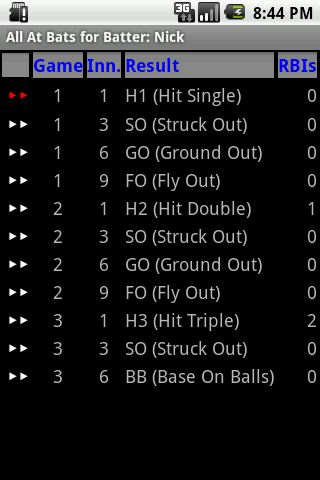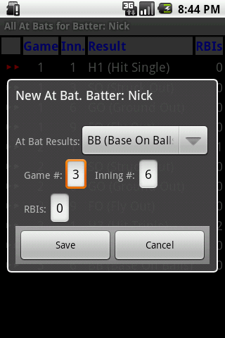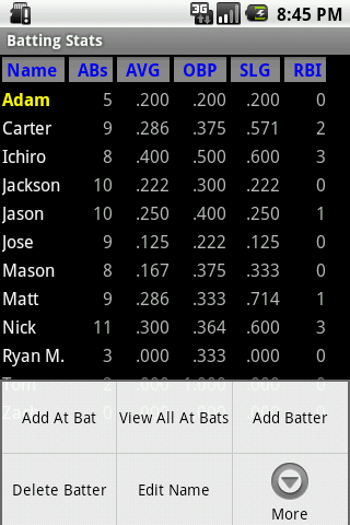 Ad Free And Uses No Data Time! Batting Stats tracks and reports baseball/softball batting statistics. Just enter in the names of all your players to track, and then each time they bat just enter the at bat outcome (BB, 1B, SO, etc.). Batting Stats reports the batting average (AVG), on base percentage (OBP), slugging percentage (SLG), and RBI count. Batting Stats also tracks every at bat (Ks, HRs, SO, etc.) for each batter. Also keep track of runs scored for each batter. All screens can be copied to the clipboard (csv format) for easy attachment to emails and text messages. With a simple, easy to use interface, Batting Stats is the ideal tool for team managers, coaches, and parents.
