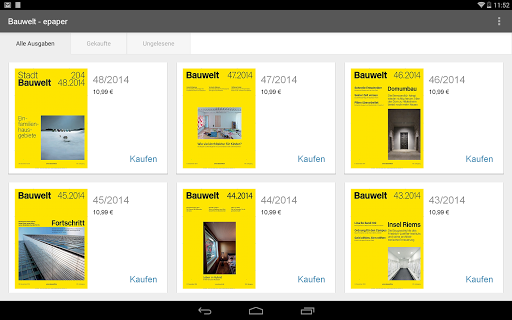 Einzelne epaper sind im PDF-Format erhältlich für 10,99 EUR pro Ausgabe. Bauwelt - epaper erscheint mit 44 Ausgaben im Jahr.