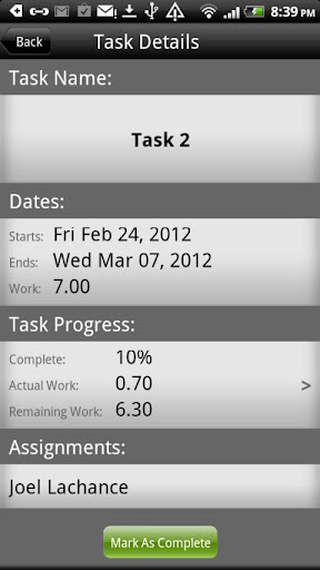 Application brings to user views of tasks, milestones and allows time tracking and reporting functionality. Users can filter their tasks for today, see all their tasks, completed tasks and enter task updates by reporting actual time or percent complete on the task, or start interactive timer that will record time spent working on task. BeMo Lite implements “Hours of work done per period” mode for progress tracking, and requires Project Server 2010 PWA available over internet or network connection to PWA from corporate network.