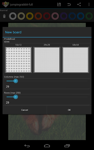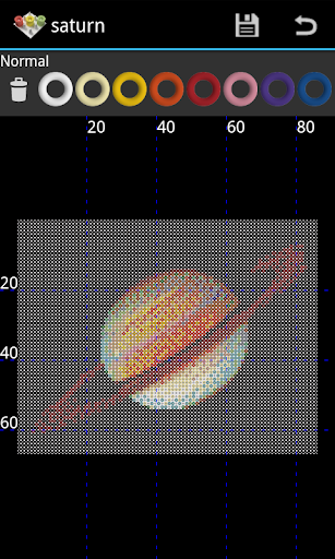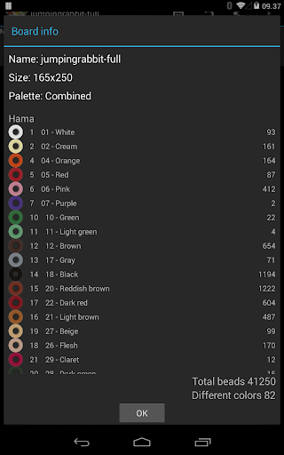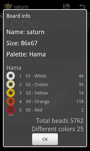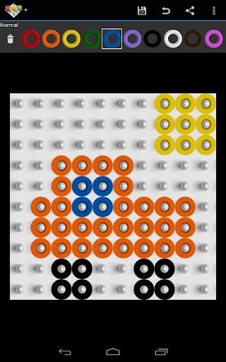 In Bead Studio you can convert your image saved on the Android device or from the built-in camera to photorealistic fusible bead designs using the chosen palette of colors like HAMA. Use the image editor to select a subsection of the image and control contrast, brightness and gamma. Tip: Because the number ‘pixels’ on a board is often limited when making designs that can be transferred to real beads afterwards it pays to select a smaller section of the image to achieve the best possible results. It can also yield better results if you exaggerate the contrast and brightness of the image before conversion.