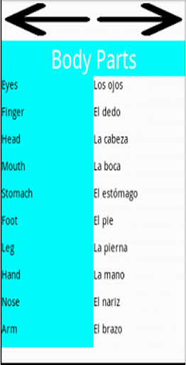 This app is called Beginners Spanish. This app is for students or adults, who want to learn basic Spanish words. There are 7 sections of vocabulary. General Greetings, Foods, Body Parts, School Items, Colors, Places, and Others. The other 2 screens are the Home Screen and the Vocabulary Screen where you can see each 7 sections of vocabulary. Each page broadcasts a series of words relating to the topic. The Others Screen shows a vocabulary website where you can get familiar with more Spanish terms.
