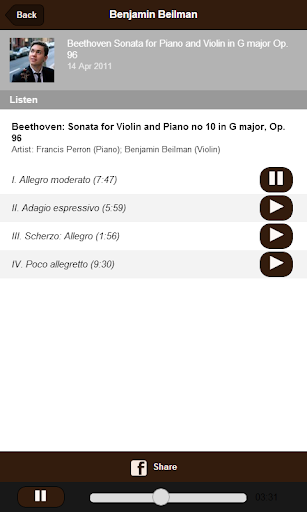 Listen to selected Benjamin Beilman live recordings on your mobile device. All repertoire information including composers, works, soloists, conductors and ensembles is included. View artwork and program notes. High quality audio options are available if you are connected through a high speed network.
