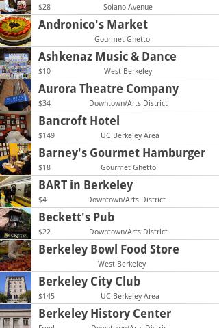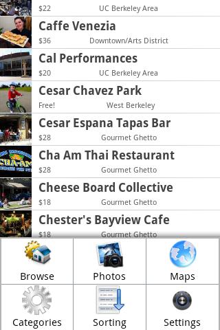 All the entries are also organized by Neighborhood. Berkeley offers several distinctive districts, such as the Gourmet Ghetto of North Shattuck. Other special neighborhoods include the UC Berkeley Area, Downtown/Arts District, Elmwood, Fourth Street, Solano Avenue, Telegraph Avenue, The Hills, and West Berkeley. All the 400-plus photos in the app are by Lee.