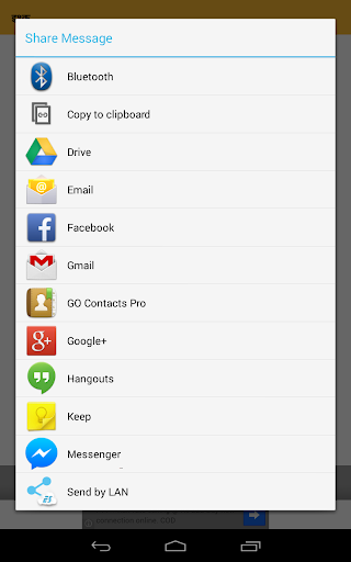 Tap the share icon below to share your favorite custom messages to contacts via SMS, E-Mail, old Bluetooth way, Facebook or Twitter, gmail, whatsapp, viber, twitter application...!!!