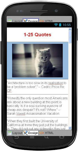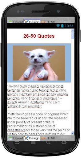 We hope you all like these superb android quotes application. Please Feel free to email us about any comments or suggestions and “Rate it 5” for our application to be improved. Developer Note : In case you face any problems do send us an email with information about your phone model, and the exact problem, and we'll try to fix it immediately.
