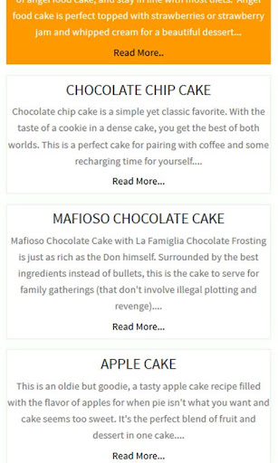 The most spectacular, wonderful...delicious cake recipes are included within this app...chocolate cake and cheese cake recipes which will delight your everyday kitchen. Enjoy! :-)