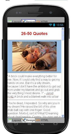 We hope you all like these superb android quotes application. Please Feel free to email us about any comments or suggestions and “Rate it 5” for our application to be improved. Developer Note : In case you face any problems do send us an email with information about your phone model, and the exact problem, and we'll try to fix it immediately.