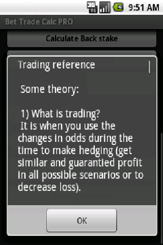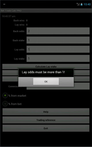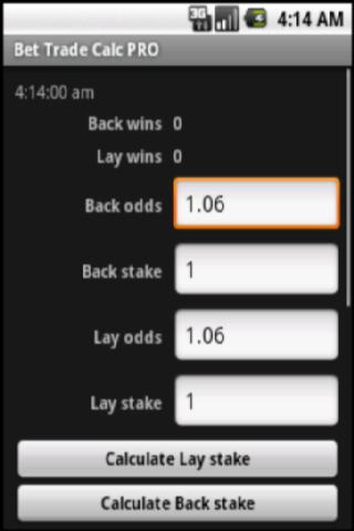 This app lets you easily calculate appropriate Back or Lay bets. Input your values and it will calculate hedging opposite stake or simply show you the result of both outcomes. It also can take into account service commission in 3 modes (no commission-it included to odds, % from winning bet, and % from whole market). So Bet Trade Calc PRO is good for trading on betfair, betpamm and so on.