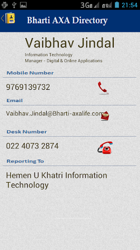 BhartiAXALife Directory allows you to search details like Mobile Number ,Telephone Number ,Email ID and their Reporting Manager Detail.This application is designed only for the usage of Bharti Axa employees.