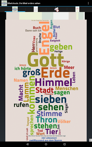 Das Buch “Bibelclouds – Die Bibel anders sehen” (Patmos Verlag 2012, ISBN 978-3-8436-0233-4) ist in Form dieser Android App im Google PlayStore erhältlich. Mit der neuen Version 3.0 können Bibeclouds und Begleittexte auch ausgedruckt werden. Die Auflösung der Grafiken und die Formatierung der Texte entsprechen nicht der Buchvorlage, sind aber für den einzelnen Gebrauch trotzdem sehr gut geeignet. Für den Druck über Google Cloud Print empfehle ich die Cloud Print App von Paulo Fernandes. Das Bibelclouds-Spiel (ab Android Version 3.0) ist weiterhin enthalten.