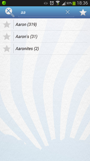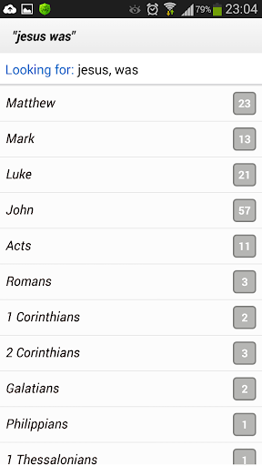 - Alphabet index of all words from the Bible (total in app 12839) ("the, and, of" are excluded - don't use them in search query)