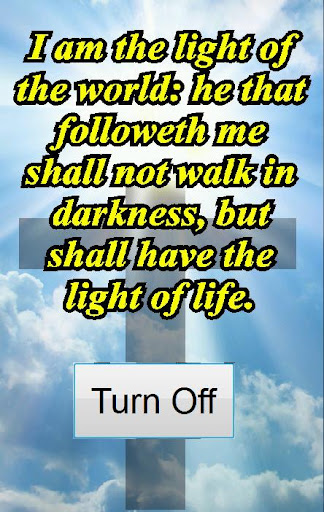 Bible Flashlight app is a flashlight app that displays Bible quotes on the screen when the flashlight is turned on. Turn on the flashlight and random bible quotes about light appear on your screen. Idea for those who like religion, the Bible and wise quotes. Great Christian app! Guide your way in the darkness while viewing King James version bible messages about "light".