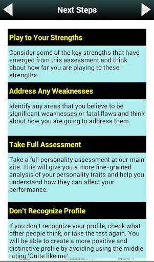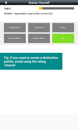 Your privacy is protected. There is no registration process and we do not ask for your email address or any personal information. Once you exit the app, your test responses are lost unless you decide to save your test scores on your device. There is no internet link between the app/your device and MySkillsProfile's server.
