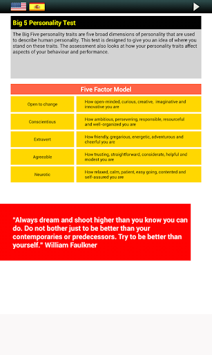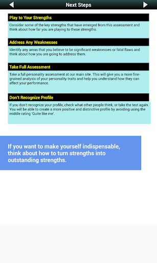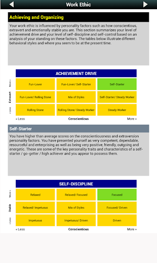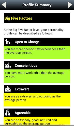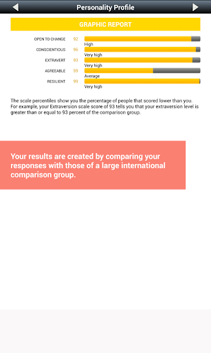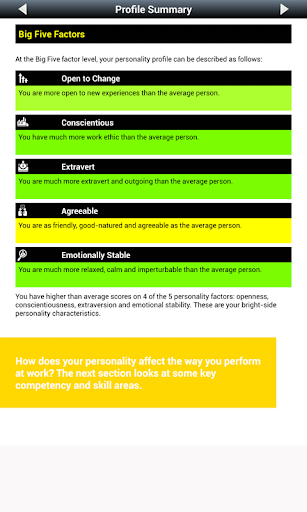 A rapid but scientifically robust personality assessment test summarizing an individual's personality profile across five broad areas of personality - Openness to Change, Conscientiousness, Extraversion, Agreeableness and Emotional Stability. The test-taker receives a graphical profile in percentiles and a summary report covering their personality traits.