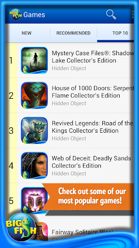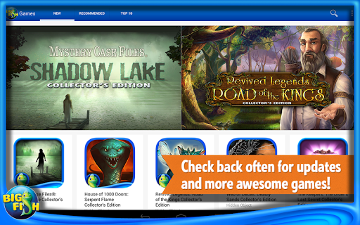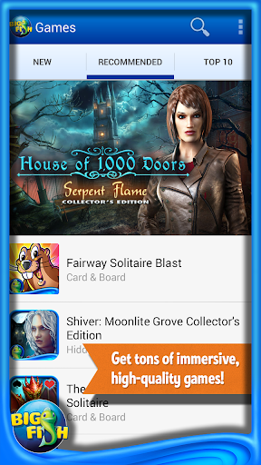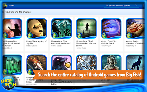 Discover new Big Fish games for your Android devices! Be the first to know about new releases, see recommended games, and search for games with ease all with one app! Big Fish is THE place to find the best high-quality, immersive game experiences with no virtual items and no interruptions. Try each one free, unlock it once, and own it for life!