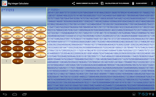 Prime factors of an integer can be calculated. For example, 2^67 - 1 can be found by finding 2^67, then subtracting 1. Pressing the prime factor button will then search for factors of this number (in the case of this number, "Cole's number", the Pollards Rho depth will have to be increased using the menu, but the app can find the two factors).