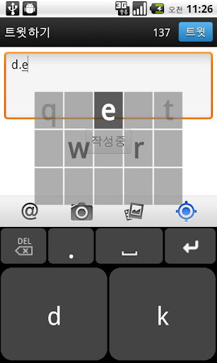 버튼을 터치한 후 상하좌우로 연속적으로 움직여 원하는 글자를 선택합니다.