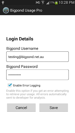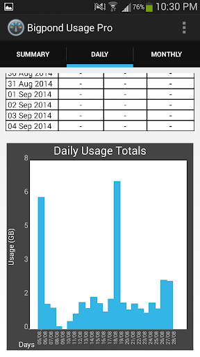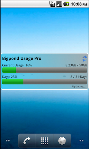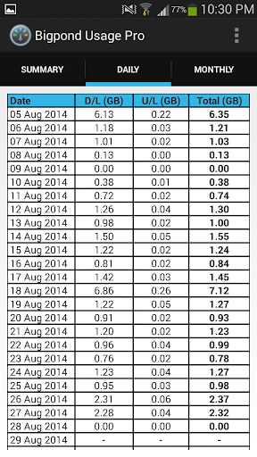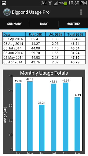 This application gives you a summary of your Bigpond Cable and/or ADSL Internet usage plus a daily and monthly breakdown in both table and graph formats. There is also a 4x2 widget available to add to your home screen which updates usage once an hour. There is no advertising within the app....ever!