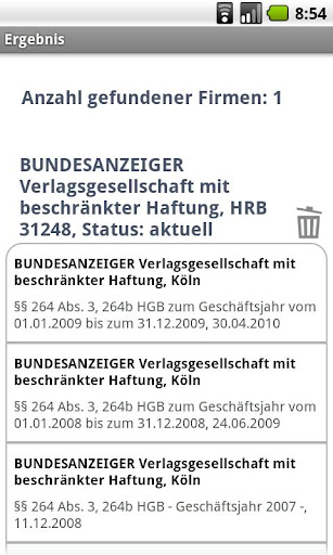 Als Suchergebnis erhalten Sie eine Liste mit Firmen und deren Veröffentlichungen. Zu jeder Firma werden der Firmenname, die Registerart, die Registernummer und der Status (aktuell/gelöscht) und zu jeder Veröffentlichung der Firmenname, der Firmensitz, der Titel der Veröffentlichung und das Veröffentlichungsdatum angezeigt. Durch Auswahl einer Veröffentlichung aus der Liste können Sie sich den Inhalt der Veröffentlichung ansehen.