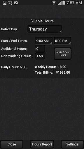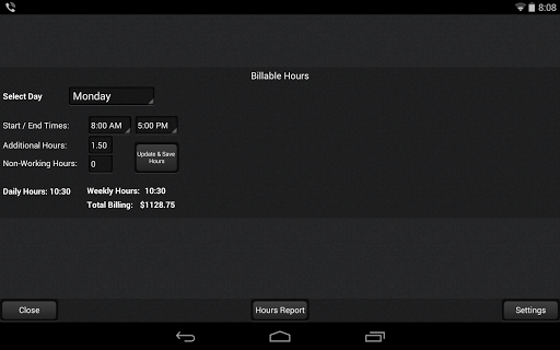 Billable Hours allows you to track on a weekly basis work start and end times, additional or overtime hours and non-working time to automatically calculate billing from your hourly rate. Easy to read and work with in both light and dark themes, billable hours is a simple to use but powerful contractor and professional hour manager and billing calculator.