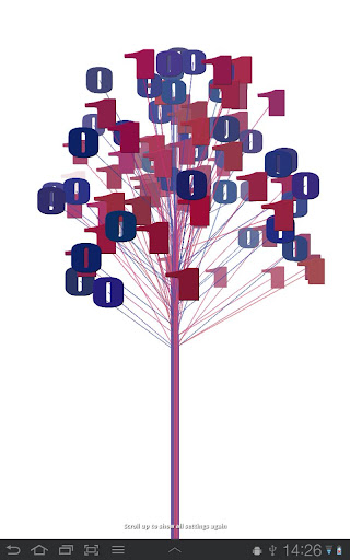 A tree with ones and zeros as leaves. Branches sway slowly and the tree spins smoothly around it's own axis as you scroll between home screens. Tree branches die after a while and fade away, and a new branch is born, growing up from the trunk led by a glowing cursor. As the branch is fully grown it explodes in a light flash and leaves a new 1 or 0 as the leaf.