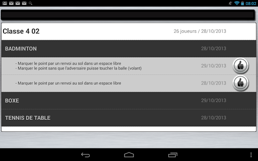 C'est également une application de synthèse qui vous permet d'avoir un bilan global sur vos tests, sur les élèves, en comptabilisant leur participation en match, les victoires, les matches arbitrés, les taux de réussite sur un match ou un cycle complet de matches.