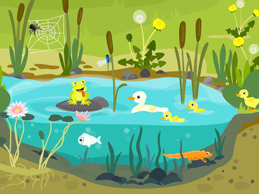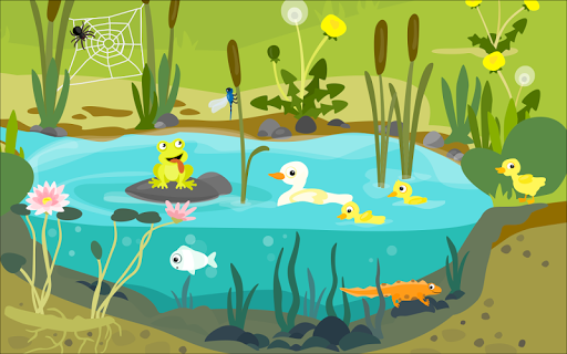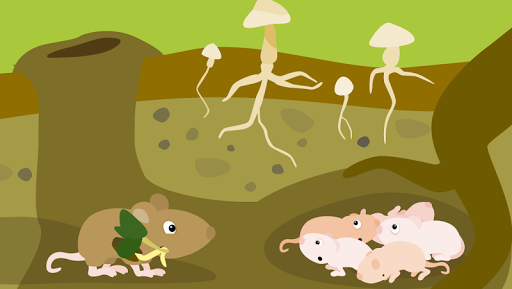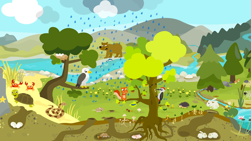 The squirrel, woodpecker, bark beetle and bees live in this biotope. The rabbit and the mouse have their underground tunnels, their young tucked away in their home shelters. A buzzard chases after a mouse and feeds its young - freshly hatching out of their eggs. Even the snake is quick to have eyes for the little mouse. The bear attempts to catch fish from the river while the hedgehog tugs on a rain worm. A bud sprouts from an acorn and mushrooms pop up out of the ground. Tap on the clouds and rain begins to pour down.