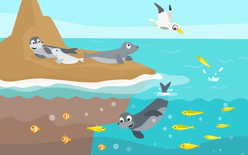 The fish, the sea horse, jellyfish, octopus, sea urchin, molluscs and the large, greedy shark dwell in this busy biotope. The seagull and the seal snatch a fish. A fish swallows a snail. The turtle lays its eggs in the sand and the crabs have a little quarrel. The seal family sun themselves on an island and splash around in the sea. Tap on the sun and watch the water evaporate to form little clouds.