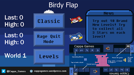 -Choose between 2 characters! Blue Birdy is Flappy (Tap to Flap), while Red Birdy prefers to glide (Hold screen to go up and let go to go down)