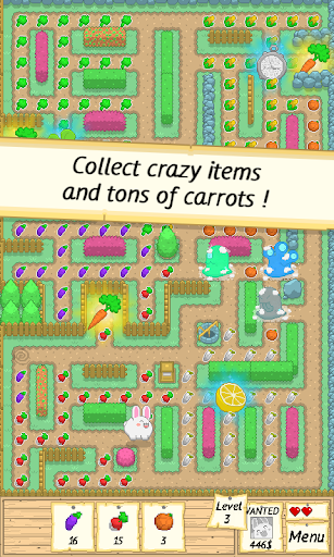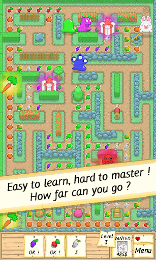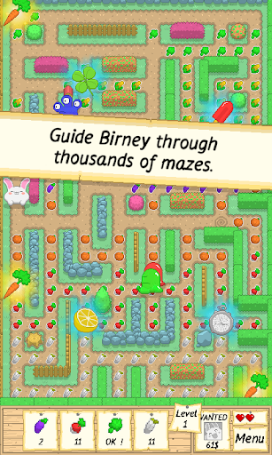 Birney feels a bit peckish ! Luckily, Gedeon is growing all kinds of vegetables in his farm and he has more than enough for his needs. Only one problem : his kitchen garden is a real maze and he hired a band of slimy monsters to guard his crunchy carots. But it takes a lot more to discourage the appetite of a bunny !