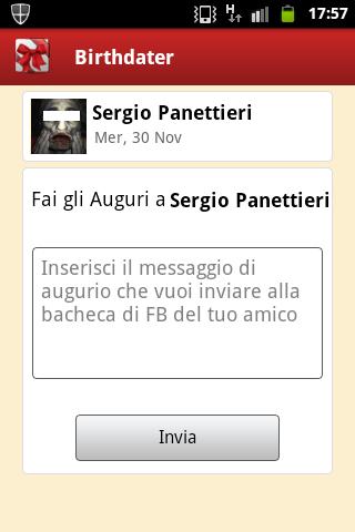 ☺ SAY HAPPY BIRTHDAY: you don't need to spend time to say Happy Birthday to your friends!! Birthdater has a "Built-In Facebook Wall Writer System" that lets you write on your friend's Facebook Wall directly from the App without loosing any time!
