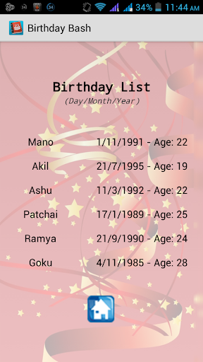 The Birthday Bash application will display the list of all Birthdays today and the upcoming Birthdays for the next few days in the home page. The user can set the time of notification for the birthday remainder in the preference section. Any number of Birthdays can be stored and birthdays of important persons or celebrities can also be stored.