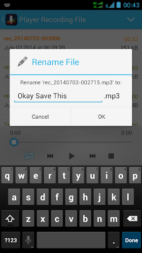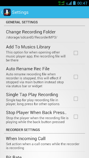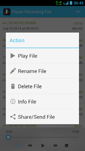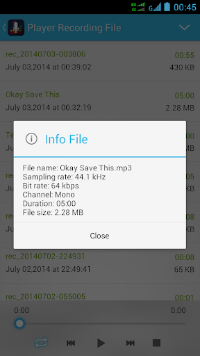 • Get info about of recording file [File name, Sampling rate, Bit rate, Channel, Duration, File size]