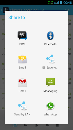 • Share/send recording file to media [BBM, Whatsapp, GMail, MMS, Bluetooth, etc]