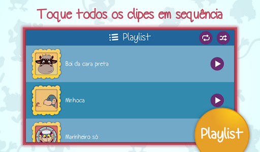 - 26 clipes (1 GRÁTIS) - Boi da Cara preta, Cabeça, ombro, perna e pé, Como pode um peixe vivo, Fui morar numa casinha, Minhoca, Cachorrinho está latindo, Marinheiro só, Borboleta Pequenina, Pintinho amarelinho, Pirulito que bate bate, Sambalelê, Peixinho, Marcha soldado, Borboletiinha, Coelhinho da Páscoa, Cai, cai, balão, Sapo não lava o pé, Da abóbora faz o melão, Fui no itororó, Onde está a margarida?, Onde vai morena?, Osquindolelê, Pombinha Branca, Roda pião, Sapo jururu, Se essa rua fosse minha.