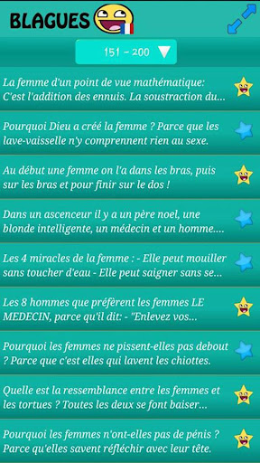 Les blagues sont classées en 22 catégories : Animaux, Belge, Belle mère, Blague courte, Blonde, Chuck Norris, Combles, Contrepeteries, Devinettes, Enfant, Femme, Histoire drole, Homme, Humour Noir, Les gens célèbres, Les blagues longues, Métiers, Monsieur et Madame, Personnes agées, Population, Religion, SMS Humour, Ta mère..., Toto, Voitures............