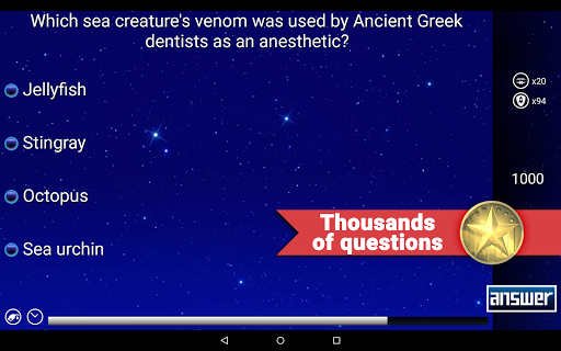 A fun and frantic game of multiple choice, Blast Trivia has been Android’s favorite trivia quiz app since its debut in 2011! Play through a vast, expanding collection of questions in a variety of categories against yourself or the world! Free forever - Download now!