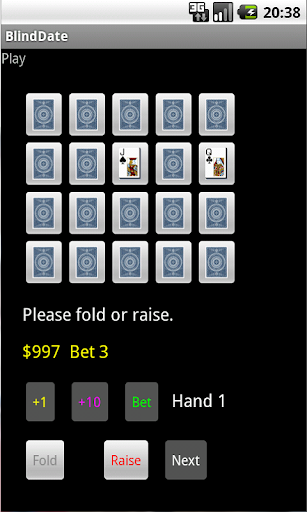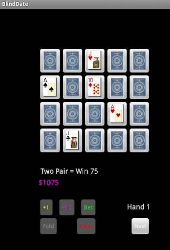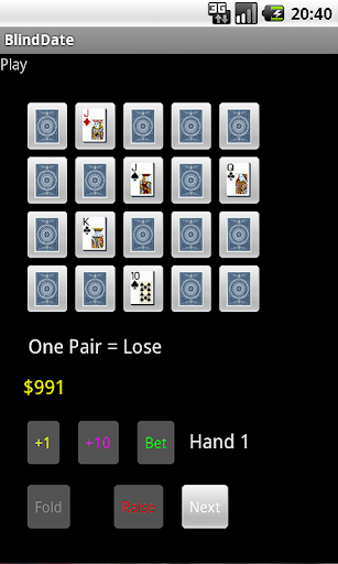 Blind Date is a casino poker like game. A player plays against the house dealer. It is played with a deck of 20 cards consisting of A,K,Q,J,10 in four suits. A player begin the game by putting ante bet and then the dealer deal all the cards face down and then randomly flip up two cards. The play has to fold or raise by putting a bet amount twice the ante amount and then flip up three cards to form a poker hand. The player wins the game when he/she has a pair of KK and a second pair of any value or other better poker hand. The payment to all the bet amount is as follow :-