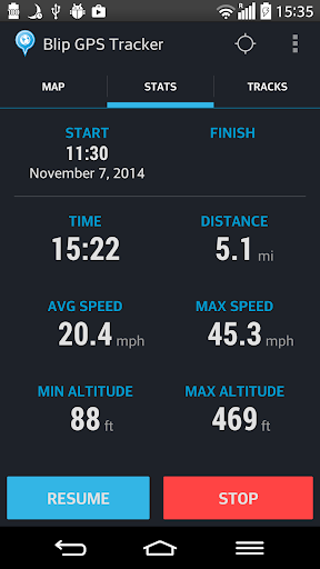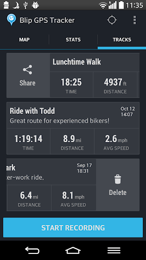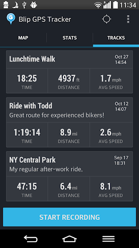 The unique feature of the app is the ability to follow already recoded tracks: just open the track in the app, turn GPS on and follow the path displayed on the map. Blip GPS tracker can also show your current location information, including latitude, longitude, altitude and bearing without actually recording a track. This is useful when you are curious about how fast and high your plane, train, bus, bike, etc. is moving!