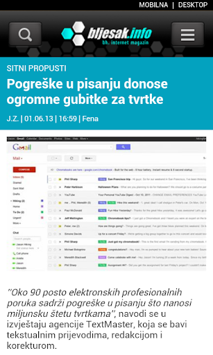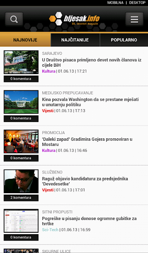 Android verzija portala bljesak.info. U nedostatku službene aplikacije, ova koristi mobilnu verziju ovog portala. Pišite u komentarima ako nešto ne radi kako treba ili nikako, pa ću pokušati to i popraviti.