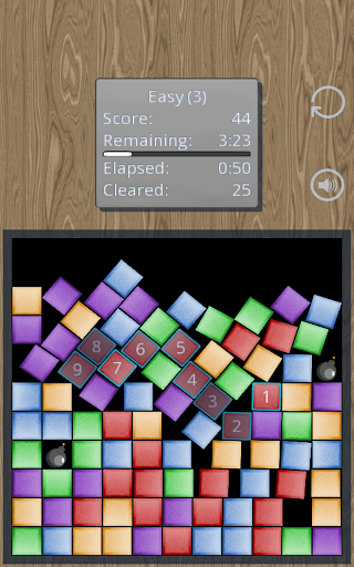 There are multiple levels of difficulty with each level requiring more blocks to be selected to complete a move. The most difficult level also randomly rotates and shakes the game area while you are playing.