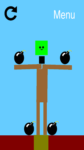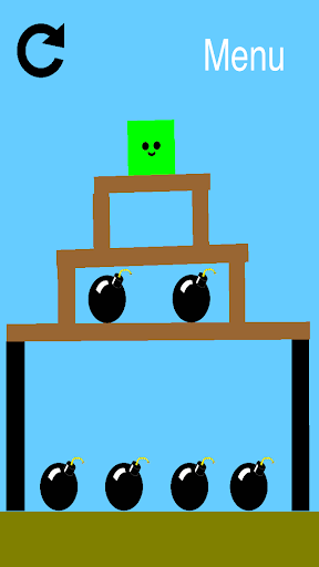 Get the green player to the ground by removing brown (wooden) blocks and avoiding the bombs.