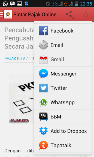 Artikel dalam Aplikasi Blog Pajak Indonesia dapat dengan mudah dibagi atau di-share ke teman-teman Anda melalui email, facebook, whatsapp, BBM dan sebagainya.